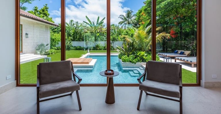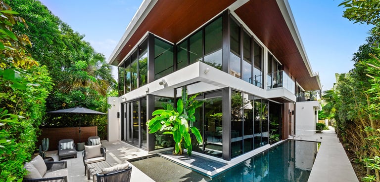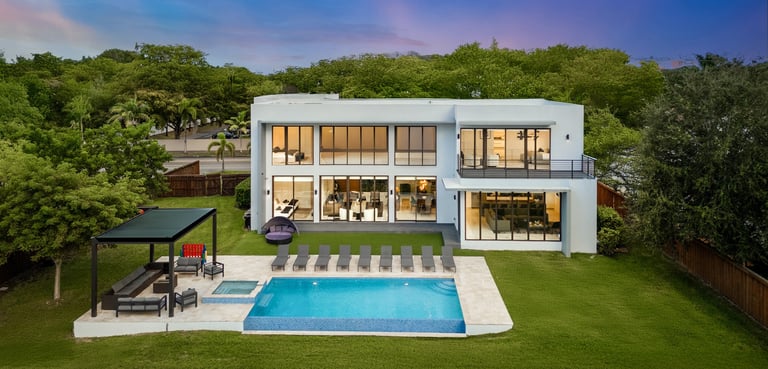Among the finest Miami luxury vacation rentals, this stunning modern villa masterfully blends Miami modern and Caribbean influences, offering 5 en-suite bedrooms and six baths within the prestigious tree-lined streets of Coral Gables. Surrounded by lush tropical rectangular grounds and sheltered by majestic trees, this exceptional property creates an intimate paradise within the city.